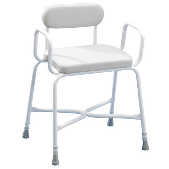 This padded shower chair with armrests is available with or without a backrest for extra support. It has a weight capacity of 560 pounds Learn more! |